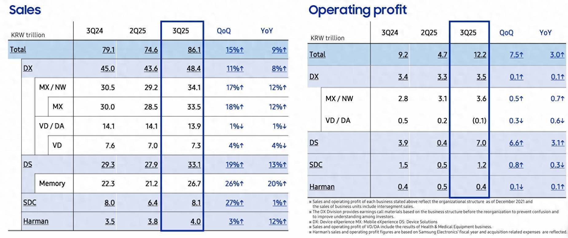 三星电子周四公布的财报骄慢,该公司第三季度销售额为86.1万亿韩元,同比增长9%;贸易利润为12.2万亿韩元;净利润为12.0万亿韩元,高于分析师平均预期的9.3万亿韩元。