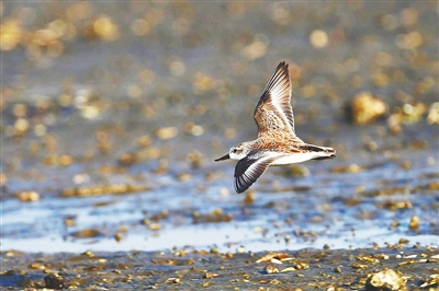 11月9日,儋州湾公益林管护员及志愿者在儋州湾滩涂开展水鸟监测时,纪录到3只国度一级要点保护野纯真物勺嘴鹬。