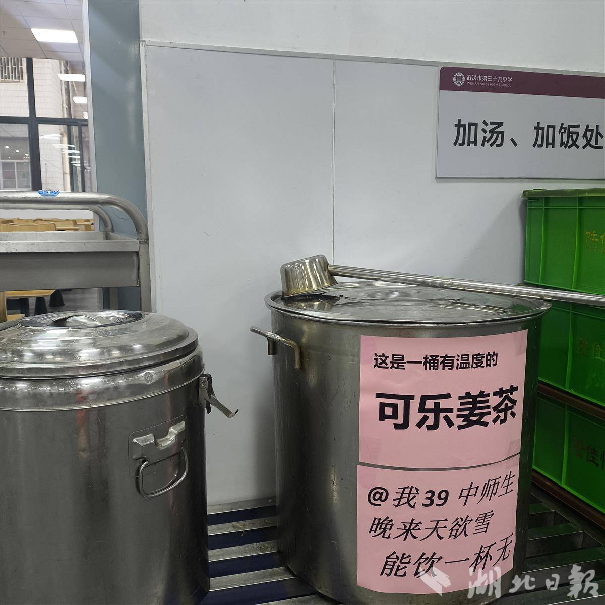 而在武汉市第三十九中学,食堂早早熬好了姜汁可乐,一杯杯繁荣兴旺的饮料,成了雪天里最贴心的致敬。