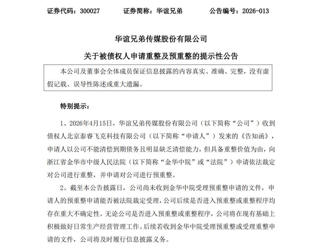 4月15日,华谊昆季传媒股份有限公司(华谊昆季,300027.SZ)公告,当日,公司收到债权东谈主北京泰睿飞克科技有限公司(以下简称“肯求东谈主”)发来的《见告函》,肯求东谈主以公司弗成送还到期债务且显明短少送还智力,但具备重整价值为由,向浙江省金华市中级东谈主民法院(以下简称“金华中院”或“法院”)肯求照章裁定对公司进行重整,并肯求对公司进行预重整。